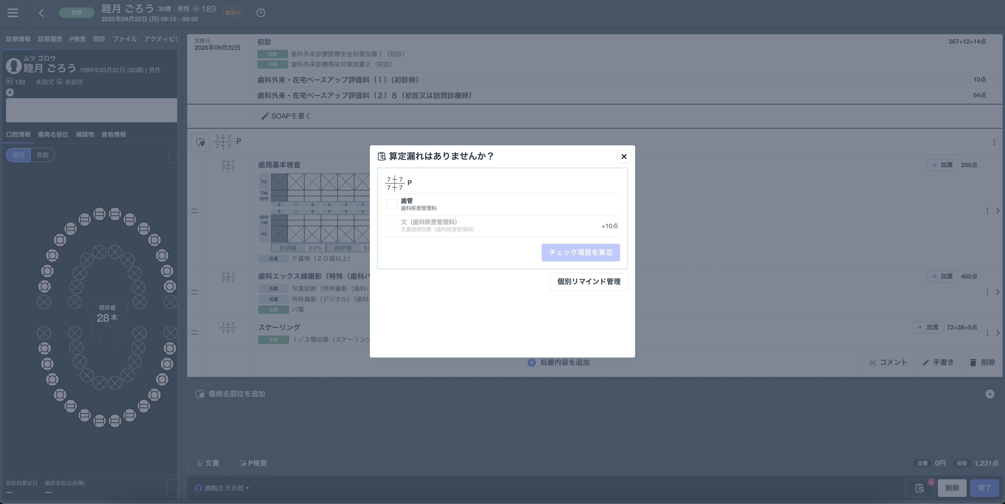 算定リマインダー(アシスト)機能は、該当する病名に対して処置を入力する際に登録されていない所定の処置がある場合、リマインドを行う機能です。2025年3月にリリースされましたが、今回の追加の機能アップデートにより、よりカスタマイズしたリマインド設定ができるようになり、A患者は医管がリマインド必要だが、B患者は不要などの設定も可能になりました。