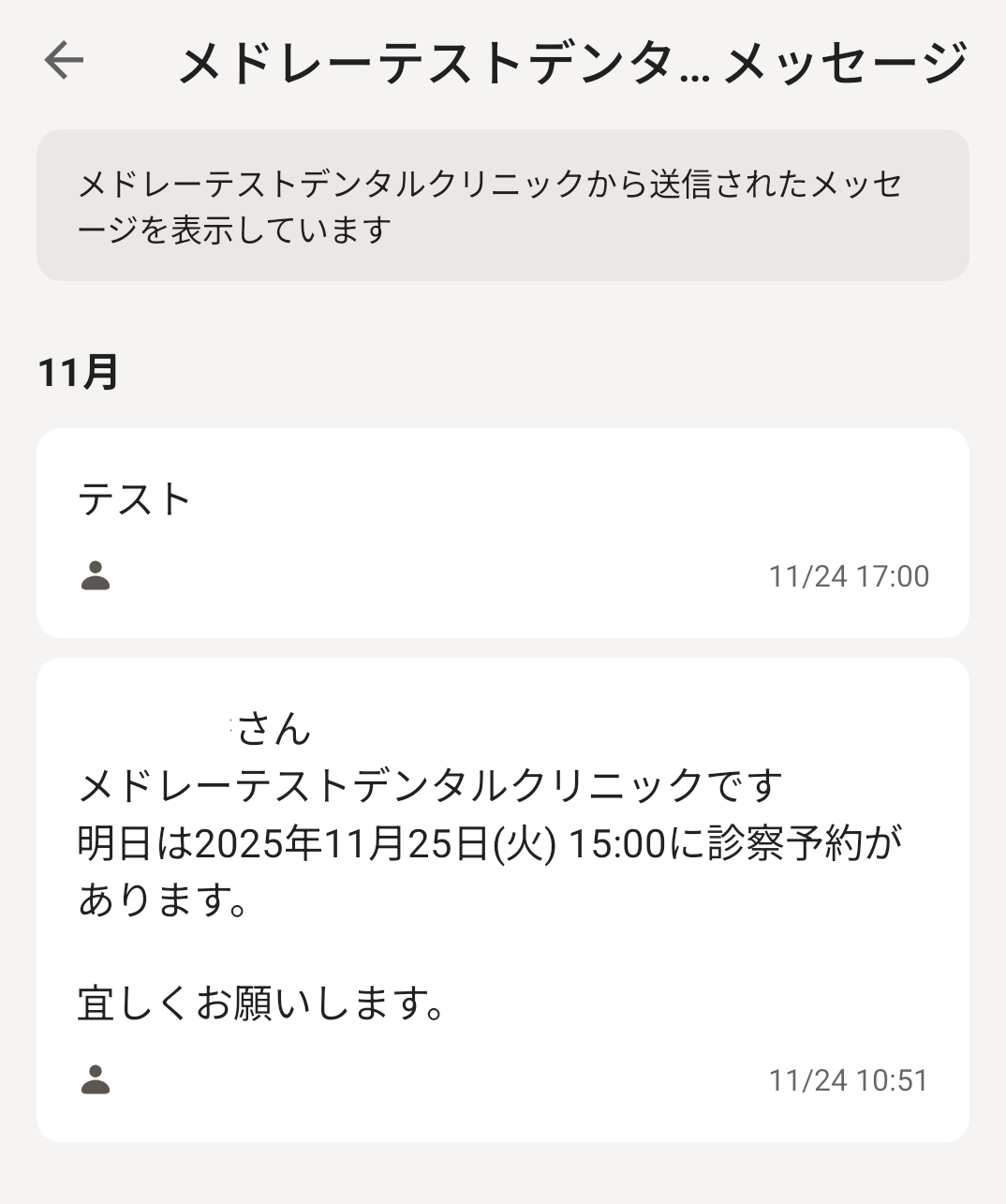 予約前日にプッシュ通知が届くため、予約忘れを防止できます。また、医療機関様からメッセージも送信できるので定期検診や医院からのお知らせもアプリで確認いただけます。