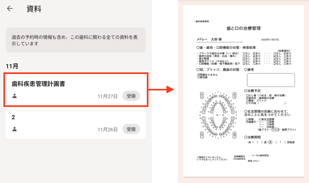 検査結果や説明資料などをペーパーレスでアプリに共有することができます。提供文書や同意書、レントゲンなど医療機関様から共有した資料を患者様はアプリからいつでもデータを確認できますので、患者様自身のデンタルIQの向上や健康意識増進にも寄与できます。
