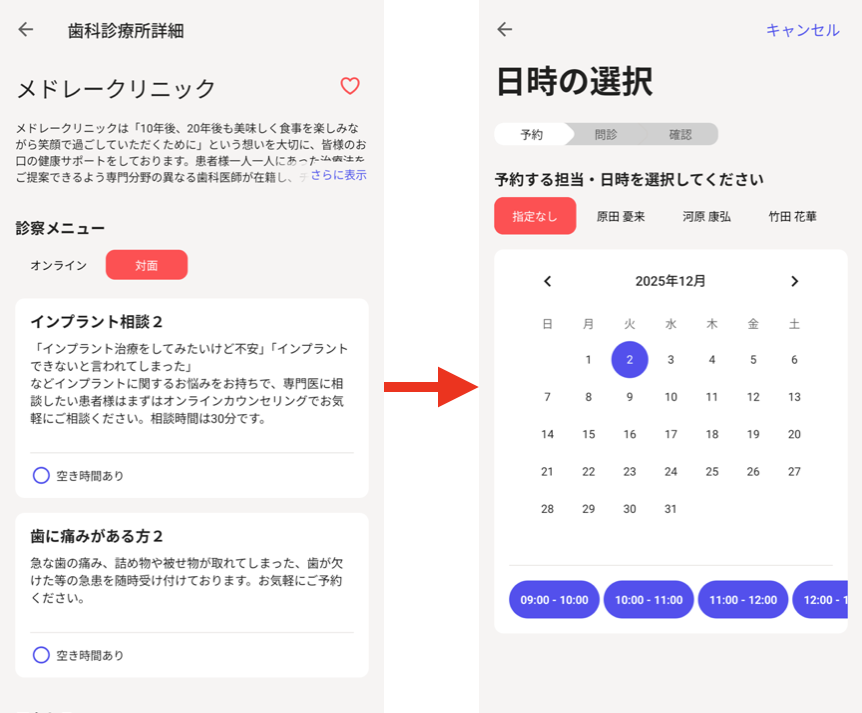 アプリからいつでも予約を取れます。事前に問診の入力をしてもらうこともでき、来院時の紙の問診票を記入する手間がかかりません。