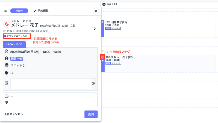 DENTISには患者ごとに「アレルギーあり」「感染症」などラベル管理を行う機能があります。今回「注意喚起フラグ」を設定できるようにアップデートしました。注意喚起フラグを有効にすると、そのラベルが付与された患者の予約枠にアラートが表示されます。アレルギー情報や特別な配慮が必要な事項を、予約画面上で直感的に検知できるようになり、事前の準備や受付時の見落とし防止に役立ちます。