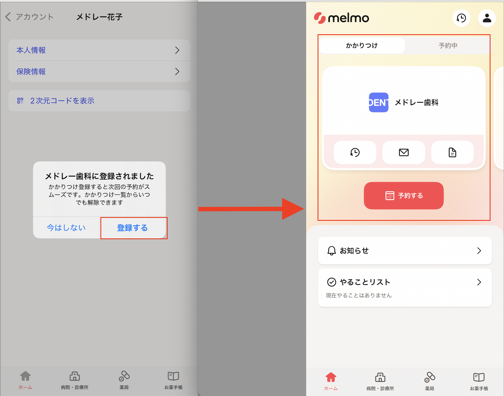 DENTISとmelmoを紐づけたタイミングで患者様へプッシュ通知を送信し、「お気に入り登録」を促すことが可能になりました。お気に入り登録が完了すると、アプリのトップ画面に常に医療機関が表示されるようになり、より手軽に予約や資料の確認ができるようになります。患者様の利便性を高め、リピート受診や円滑な情報共有をサポートします。