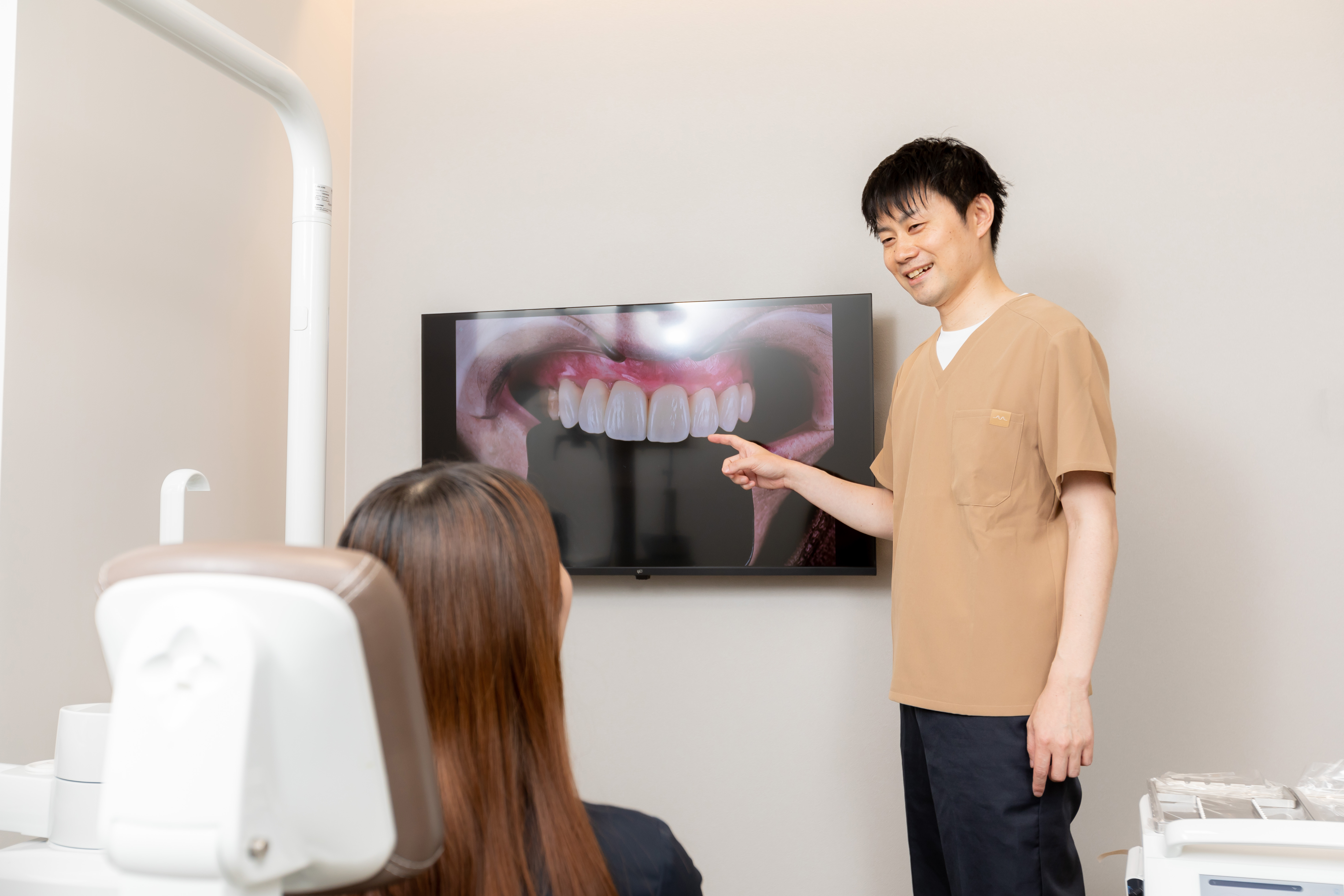 診察: マイクロスコープでの映像などを活用し、治療内容を詳しく説明。カウンセリングルーム等でアプリ登録をご案内。