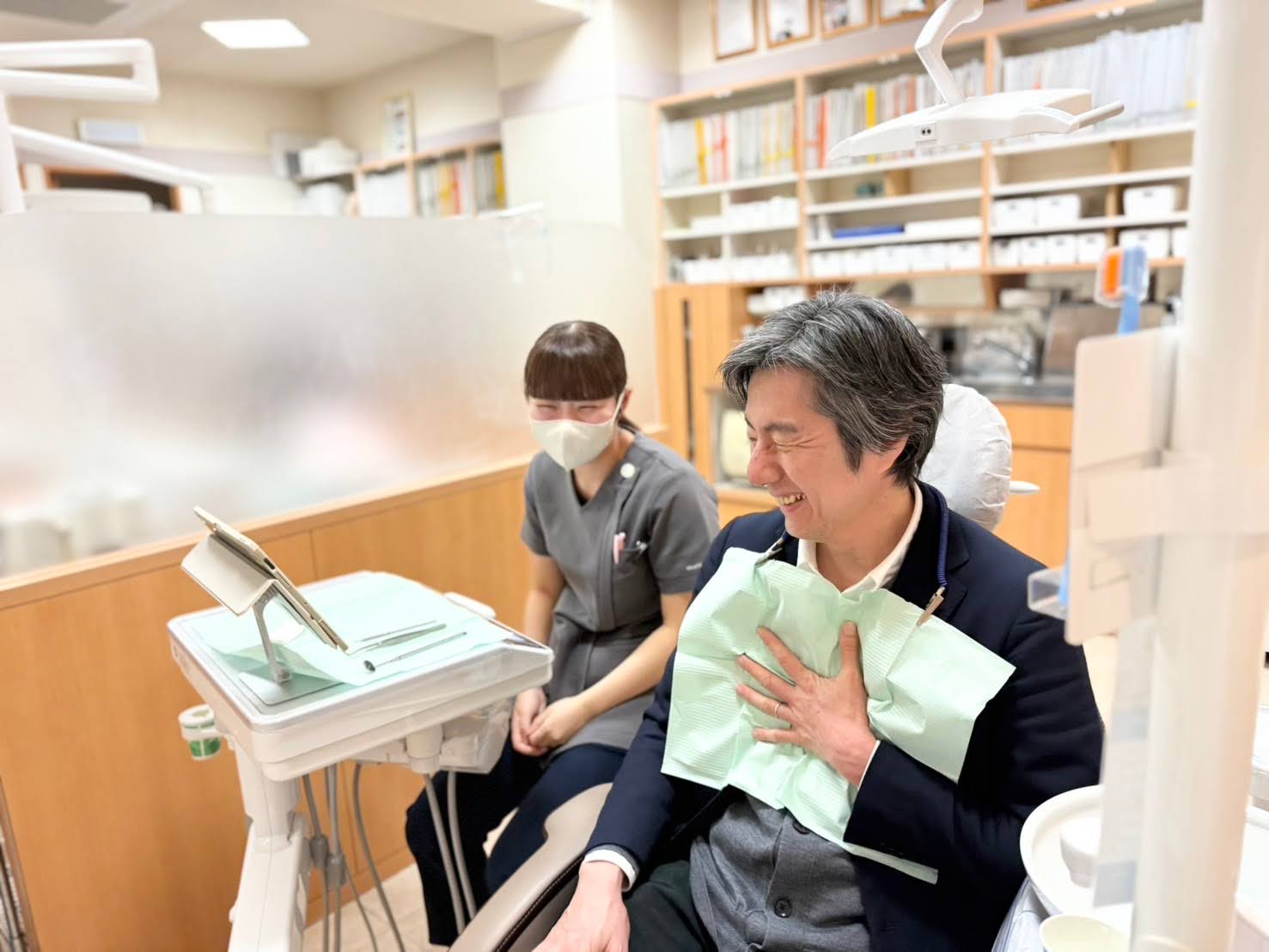 患者様とのコミュニケーションをとても大事にしており、患者様とスタッフの楽しそうな笑い声がいつも聞こえてきます。患者様には穏やかで歯医者っぽい感じがないと言われますね(笑)。